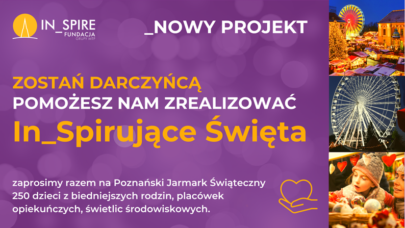 Już tej zimy na terenie Międzynarodowych Targów Poznańskich powstanie jeden z najwspanialszych Jarmarków Bożonarodzeniowych w Polsce. To czas radości dla wszystkich, małych i dużych. Fundacja In_Spire pragnie wspólnie ze swoimi Partnerami sprawić, by tę radość poczuły dzieci, którym na co dzień trudniej skorzystać z takich atrakcji i na chwilę zapomnieć o ciężkich doświadczeniach.