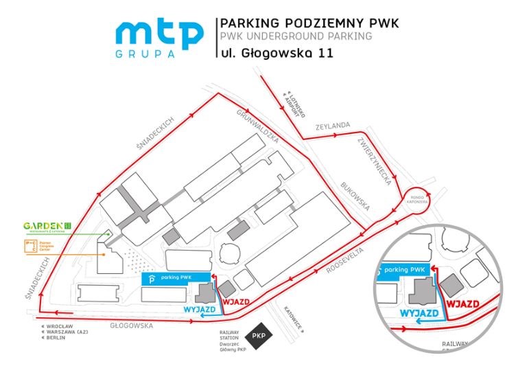 Parking podziemny zlokalizowany jest przy ulicy Głogowskiej 11. Wjazd na parking znajduje się tuż za budynkiem Centrum Targowego, na wysokości dworca PKP, w miejscu po byłej restauracji Adria.